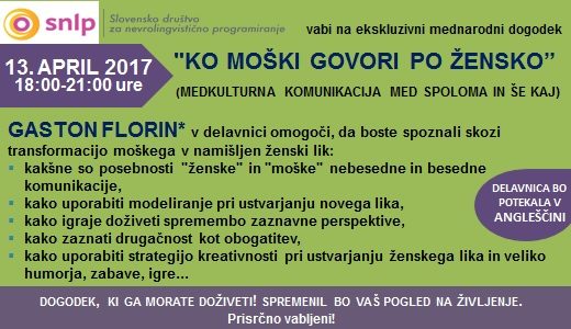 Želite ustvariti zaupno komunikacijo z nasprotnim spolom, se želite izogniti nepotrebnim nesporazumom in izstopiti iz kroga nezadovoljstva, iščete praktične ideje za premagovanje medsebojnih ovir? Morda je prvi korak v novo smer udeležba na mednarodni delavnici Slovenskega društva NLP, ki jo bo izvedel Gaston Florin iz Nemčije: “Ko moški govori po […]